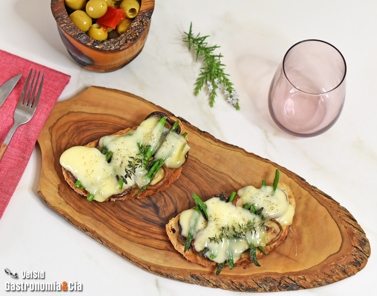 Tostadas de shiitake, espárragos y queso fundido