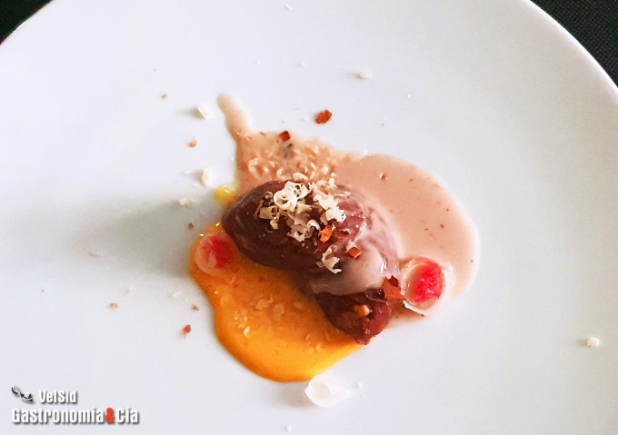 Continuando con la influencia de la cocina francesa, el chef de Ibaya convierte el clásico Pain au chocolat en un plato salado, el último plato salado del menú en el que ya introducen un elemento dulce, la masa la bollería francesa. Juegan con la cocina y con las palabras (con la pronunciación del país galo), y presentan el Lapin au chocolat, que es como la clásica napolitana, pero rellena de un guiso de conejo con chocolate, y como corresponde, se debe comer con las manos.