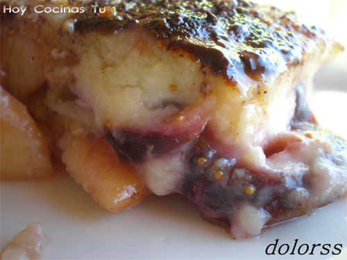 Poner un poco de crema pastelera en el fondo de una fuente e ir poniendo por capas las frutas: manzanas, plátano, peras, higos. Cubrir todo con la crema pastelera, espolvorear azúcar por encima y poner en el horno a 180º C unos 10 minutos, si no se ha gratinado, encender sólo el grill y dejar que se caramelice. Dejar templar.