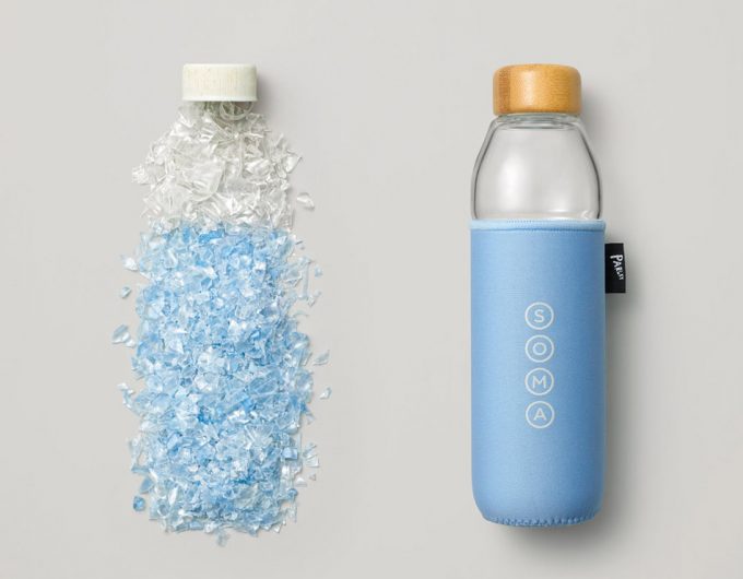 Hoy conocemos una iniciativa puesta en marcha por la empresa Soma, dedicada a la elaboración de filtros y otros accesorios para el agua, en colaboración con la empresa ambientalista Parley For The Oceans, para la creación de una nueva botella de agua que se comercializará en Starbucks y cuya particularidad es que lleva una funda de neopreno elaborada con plástico de botellas recicladas. Esta botella de cristal fomenta la reutilización, su cometido es que los consumidores la reutilicen con agua del grifo, y a su vez, pretende concienciar sobre la contaminación de los océanos.