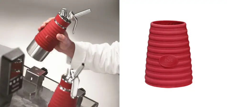 En la foto podéis ver que se trata de una funda que se ajusta a los sifones iSi, hay dos tamaños, uno para el sifón de 0’5 litros y otro para el sifón de 1 litro. Esta funda protectora para sifón de espumas está fabricada en silicona, por lo que se puede lavar en el lavavajillas, introducir en el frigorífico o en un baño maría, que son los lugares en los que se suele poner el sifón para mantener la preparación fría o caliente.