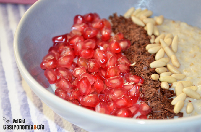 Sirve las gachas de avena o porridge en un bol y reparte a un lado la granada, después el chocolate en virutas y a continuación los piñones. A la hora de comer mezcla todo, si las gachas están calientes el chocolate se fundirá. Una delicia. ¡Buen provecho!