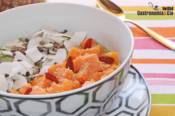 Hoy de momento no podemos hacer otra cosa que recomendaros probar estas deliciosas y nutritivas Gachas de avena con té matcha, papaya y coco, un desayuno rápido y fácil de hacer (se puede evitar el reposo si se hacen en un cazo al fuego o si no se quieren tan cremosas), y que además podéis variar al gusto cambiando algunos ingredientes, siempre se puede probar con distintas frutas, añadir unos frutos secos, etc. Esperamos que os guste