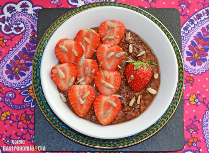 Tanto si vais a desayunar en casa como si os lleváis el desayuno preparado al trabajo (o al ‘cole’), las gachas son una buena opción, primero porque se elaboran en cinco minutos, y segundo porque son muy fáciles de transportar en un táper. Además, están tan ricas calentitas y recién hechas como frescas, sobre todo cuando aprieta el calor. Así que si os sumáis a los desayunos saludables, tomad nota de este porridge con algarroba, fresas y pipas (el nombre popular de las semillas de girasol), os va a encantar y a alimentar.
