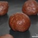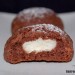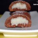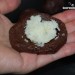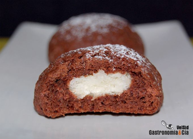 Corta la masa de las galletas de chocolate en porciones de unos 40-50 gramos y haz una bola, aplánala y pon una cucharada de relleno de coco, cierra la masa sellándola bien y dale forma redondeada. Ve posando las galletas formadas sobre la bandeja del horno cubierta con una lámina de teflón u otra tela de cocción.