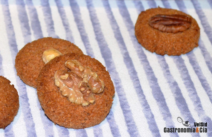 Forma bolas con la masa, que será bastante blanda, y aplánalas ligeramente, ve colocándolas en una bandeja de horno cubierta con silpat o papel vegetal. Coloca sobre cada galleta un fruto seco natural, nueces, avellanas o lo que prefieras, y húndelos para que queden fijados.