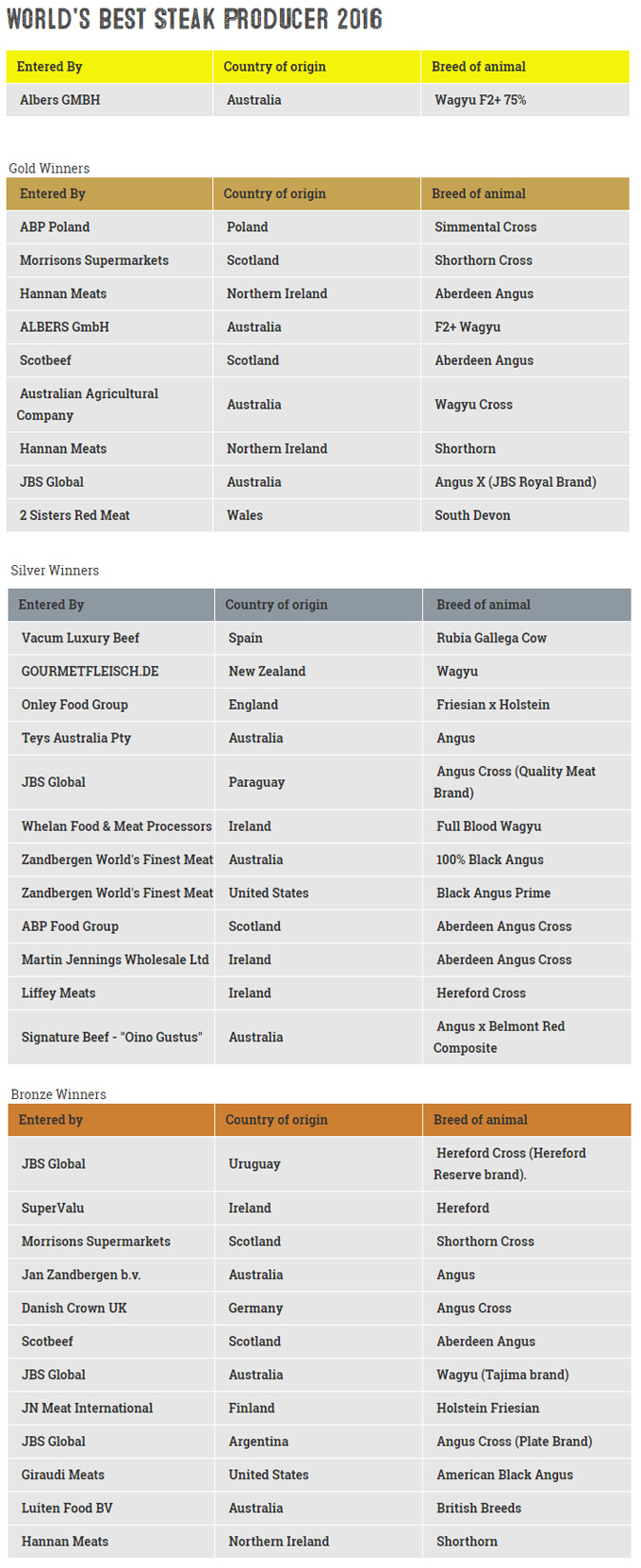 Hay que destacar que el año pasado no se presentó ninguna empresa de España, pero este año sí aparece una empresa de nuestro país, Vacum Carnes de Lujo, que presentó un filete de Vaca Rubia Gallega con la que ha logrado obtener una Medalla de Plata. Posiblemente, y a medida que este concurso adquiera relevancia, en próximas ediciones participen más empresas españolas. Seguidamente podéis conocer los galardonados con las Medallas de Oro, Plata y Bronce, el nombre de las empresas participantes, el país de origen de la carne, y la raza de ganado a la que pertenecía.