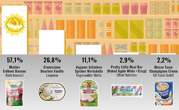 El segundo producto que ha recibido más votos es el helado Langnese Cremissimo Bourbon Vanilla que ha recibido el 26’8%, el tercero es la mortadela vegana Spicker de Rügenwalder Mühle con un 11’1%, el cuarto es la barrita Pretty Little Meal Bar de Offset con un 2’9% y finalmente, el quinto producto es la sopa de champiñones de GB Foods que ha recibido un 2’2% de los votos.