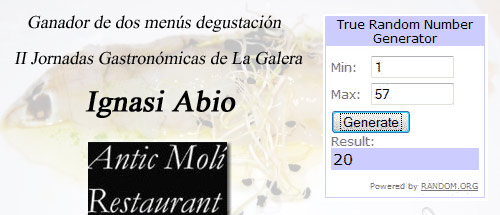 Como siempre, nos agrada enormemente dar la noticia de un excelente regalo como es dar a conocer al ganador del sorteo de dos menús degustación en las II Jornadas de la galera en L’Antic Molí (Ctra. Ulldecona-La Sénia km. 10, Tarragona), como pudísteis contemplar en el post II Jornadas de la galera en L’Antic Molí, se trata de un premio para dos personas que podrán disfrutar de un menú degustación de 20 platos, con la galera como protagonista y con maridaje de vinos.