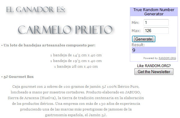 Todos sois merecedores de este regalo que han puesto en nuestras manos los patrocinadores, la empresa de fabricación artesanal Plato de Pizarra y la tienda online de productos gourmet Mandic Place, pero sólo puede haber un premiado y para ello hemos recurrido al programa de números aleatorios Random, que nos ha dado el siguiente resultado.