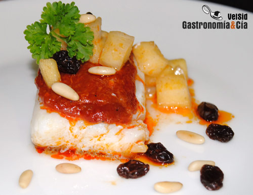 A continuación, en una sartén con un poco de aceite saltear las pasas y los piñones hasta que estén dorados. Al emplatar el bacalao, añadir la manzana alrededor y adornar el plato con las pasas, los piñones, unas escamas de sal y una ramita de tomillo.