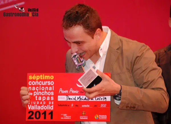 Daniel Méndez Sancho, chef del Restaurante LOFT 39 de Madrid es el campeón del Concurso Nacional de Pinchos y Tapas Ciudad de Valladolid 2011 por su pincho Buenas noticias de nuestra tierra, un steak tartar con forma de cilindro envuelto en periódico de papel comestible, emulando a El Norte de Castilla con buenas noticias, ya os comentaremos más detalles sobre este original y además rico pincho que ha recibido el premio dotado con 6.000 euros y el trofeo alegórico del certamen. El segundo premio se queda una vez más en Valladolid, Javier González de Los Zagales es el merecedor de un trofeo alegórico y 3.000 euros en metálico por su pincho Bread Bag (La bolsa del pan) que escondía en su interior un ‘bocata de calamares envuelto en obulato’. El tercer premio ha sido para Luis García Galindo del Restaurante Kaialde de Hondarribia, recibiendo un premio de 1.500 euros por su pincho Chipirones en su tinta.