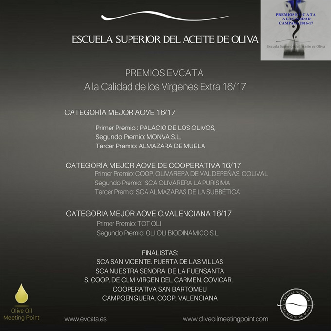 Recordemos que este concurso establecía tres categorías, Premio EVCATA al Mejor Aceite de Oliva Virgen Extra, Premio EVCATA al Mejor Aceite de Oliva Virgen Extra producido en la Comunidad Valenciana y Premio EVCATA al Mejor Aceite de Oliva Virgen Extra producido por una Cooperativa. A continuación podéis ver cuáles son los ocho galardonados en este certamen y también los cinco finalistas en las distintas categorías.