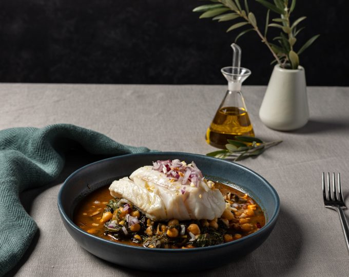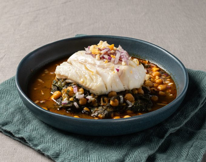 Finalmente, añadimos las raciones de bacalao previamente desalado para que se cocine brevemente en el guiso de garbanzos y espinacas, ensamblando todos los sabores.