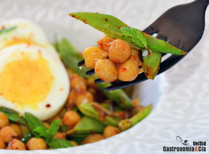 La combinación de unos garbanzos tiernos y cremosos (hay muy buenas conservas, sin pellejos y con la variedad de garbanzos que deseemos) con los tirabeques tersos y crujientes, dado que apenas se cocinan y resultan hasta frescos, nos parece magistral. Las especias que añadimos nos encantan, pimentón, comino, pimienta… y la hierbabuena fresca también tiene su valor en el conjunto del plato, así que os queremos proponer que probéis esta receta tal cual porque es un plato para repetir.