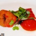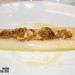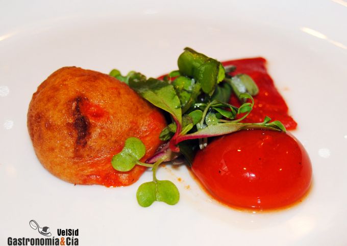 En la mesa también nos esperaban unos snacks, Cortezas de pescado y bastoncitos de trompetas. Posiblemente se anticiparon demasiado al elaborarlos, por lo que no ofrecían la textura pretendida, aunque en cuanto a sabor estaban muy bien. De todos modos el atento servicio ofrecido por el alumnado, rápidamente nos sirvió los entrantes que los alumnos de cocina elaboraron a partir de los productos de Reyno Gourmet, en primer lugar unos Espárragos de Navarra con ‘ou de reig’ (Amanita caesarea) y vinagreta de frutos secos, muy buena combinación, y a continuación y abanico de creatividad, lo que podéis ver sobre estas líneas son distintos bocados elaborados con pimientos del piquillo de Lodosa, Buñuelo líquido, chof y piquillo natural, muy buenos.