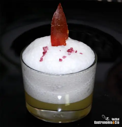 También preparamos una sopa de mozzarella, de la que no hicimos fotos, pero si os apetece probarla, cuando repitamos la publicaremos. Básicamente se elabora con nata, leche, mozzarella y sal, además de los aderezos que se quieran añadir, hay muchas opciones. Pues con un cuarto de litro aproximadamente que nos quedó, hicimos esta espuma de mozzarella para la que utilizamos el sifón, pero de no disponer de él, podéis hacer una mousse montando claras y mezclando cuidadosamente.