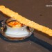 Sobre el aperitivo de coca de cacau del collaret os contaremos cuando consultemos a Germán en la cena de esta noche (Cuatromanos El Poblet-Aponiente), así que a continuación nos explicaron cómo preparaban una ensalada para comer en dos bocados, haciendo una especie de maki con obulato. Sobre las características del obulato ya os hemos contado varias cosas, como que se funde con la humedad, por lo que se tiene que rellenar con ingredientes bien secos. En el vídeo también veréis que lo explica Germán. Así que la propuesta en El Poblet es rellenar este papel de arroz (o de patata) con micro mezclum, tomate seco deshidratado y cebolla perla liofilizada. La idea es añadir también unas aceitunas deshidratadas. Como aderezo, un aceite de hierbaluisa.