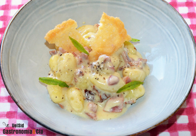 Os va a sorprender lo bien que quedan estos ñoquis cremosos con jamón y crujiente de parmesano (recordad que aquí os explicábamos cómo hacer este crujiente) con una elaboración tan sencilla y rápida, si estos bocaditos de patata también os encantan, seguro que repetiréis. Pues tened en cuenta que igual que los haréis con jamón los podéis hacer con otros ingredientes, como unas gambitas peladas, unas rodajas de pulpo cocido, unos restos de pollo asado, unos champiñones picados finamente… Tomad nota de la receta paso a paso de este one pot gnocchi y no olvidéis compartirla para que la disfruten también vuestros amigos.