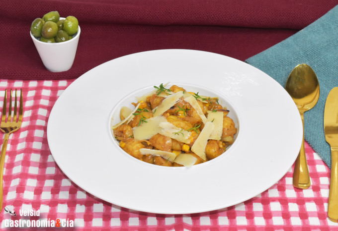 Cuando esté tierna y caramelizada, añade el maíz dulce y mezcla bien. Reincorpora al recipiente de cocción los gnocchi tostados, el queso mascarpone, un chorrito de leche o de agua si fuera necesario aligerar la salsa y salpimenta al gusto. Aromatiza también con unas hojitas de ajedrea.