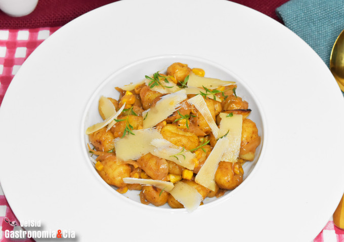 Sirve los ñoquis tostados con cebolla y maíz dulce coronándolos con unas lascas de queso parmesano y decorando con unos tallos de ajedrea. El resto es comer y disfrutar. ¡Buena cocina y buen provecho!