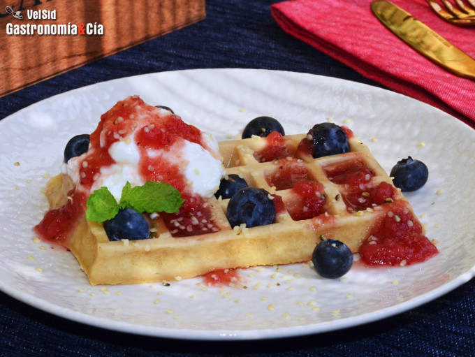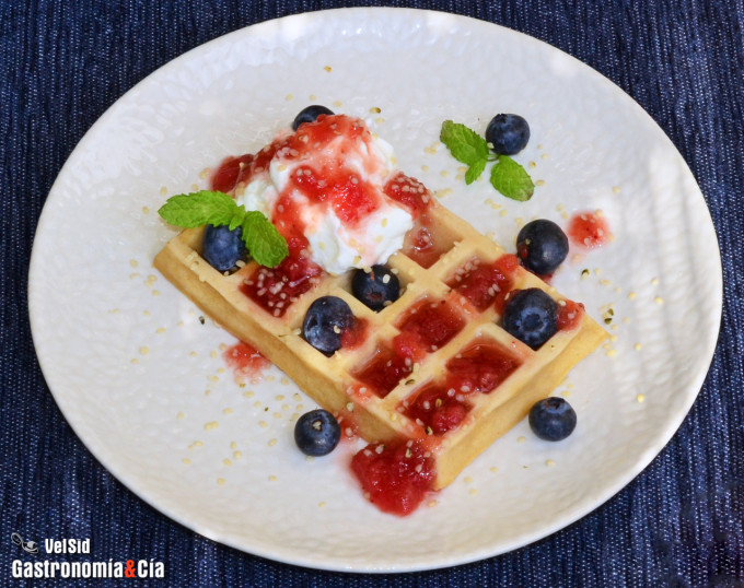 Sobre cómo acompañar estos gofres caseros, pues como a vosotros más os guste, con fruta fresca, con mermelada casera, con nata, con yogur colado, con crema de cacao y avellanas para untar, con dulce de leche… Nosotros hoy los hemos tomado para desayunar con yogur colado, mermelada de fresa, arándanos y unas semillas de cáñamo peladas. La hierbabuena no es sólo para decorar, la picamos y algún trocito de vez en cuando, combina de maravilla. Por cierto, podéis hacer esta misma receta sin azúcar para hacer un gofre con acompañamiento salado. ¿Qué os gusta más?