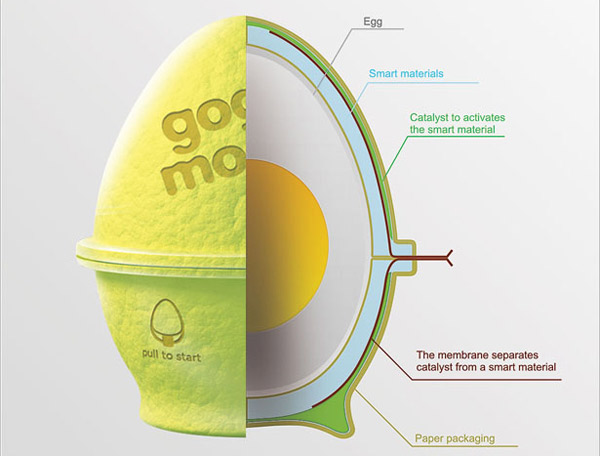 Poner en funcionamiento el contenedor para la cocción del huevo es muy simple, hay una lengüeta y al tirar de ella, el material inteligente se activa, y afirman que en dos minutos el huevo estará cocido y listo para comer.