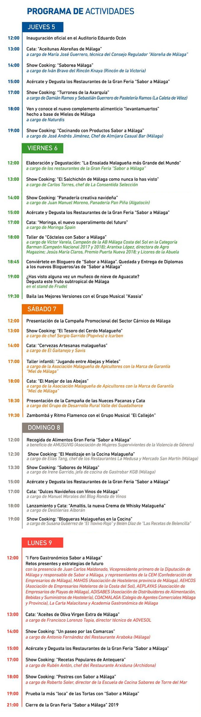 Charlas, demostraciones de cocina en directo, talleres, catas dirigidas, degustaciones… alrededor de 40 actividades programadas, se desarrollarán en torno al mercado de los productos locales, y también se realizarán nuevas acciones como la elaboración y degustación de ‘La Ensalada Malagueña más grande del mundo’ que harán los restaurantes participantes en la feria con la aceituna Aloreña o las naranjas del Valle del Guadalhorce, cómo no, o el I Foro Gastronómico Sabor a Málaga que versará sobre los ‘Retos presentes y estrategias de futuro’.