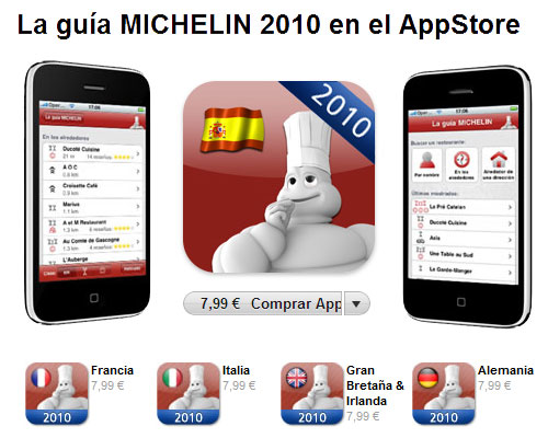 Con conexión, se sigue ofreciendo la posibilidad de conocer la opinión de los usuarios que han visitado los restaurantes y de igual modo, también podremos compartir la nuestra, previo registro en Vía Michelin. Para adquirir la Guía Michelin 2010 de España y Portugal para iPhone e iPod Touch, bastará con acceder a Apple Store y descargar la guía previo pago de 7’99 euros, el precio con respecto al año pasado se ha mantenido. Puedes conocer más detalles sobre la nueva versión digital de la guía a través de la página oficial de Michelin, aunque hay que advertir que el anuncio se ha realizado, pero aún no aparece la opción de compra en la Store.