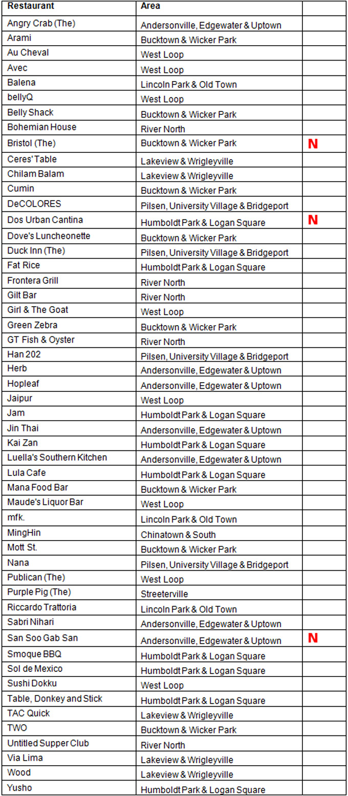 Michelin destaca los tres establecimientos que se han incluido en la lista de los Bib Gourmand de Chicago, The Bristol, restaurante que este año ha sorprendido a los inspectores por la comida estacional, sensible y fresca, el Dos Urban Cantina, establecimiento que ofrece una excelente cocina mexicana contemporánea, y San Soo Gab San, considerado como uno de los mejores restaurantes coreanos de la ciudad. Como en cada edición, los responsables de la guía roja explican que en la elección de los restaurantes Bib Gourmand se aplican los mismos criterios utilizados a la hora de conceder las estrellas, si un restaurante no reúne todas las condiciones para que se le conceda una estrella, se propone para recibir este distintivo.