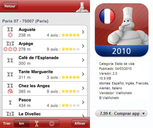 Como decíamos, estamos esperando la nueva versión digital de la guía Michelin 2010 de España y Portugal para iPhone que, seguramente estará al caer. La Guía Michelin Francia 2010 para iPhone mantiene el precio del año pasado y suponemos que las nuevas versiones también lo mantendrán. Previo pago de 7’99 euros podrás realizar la descarga a través de Apple Store.