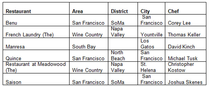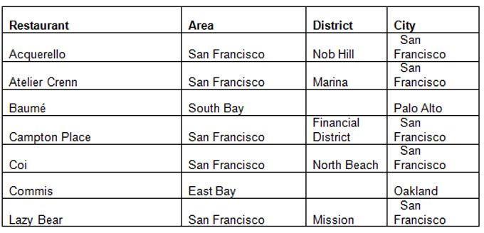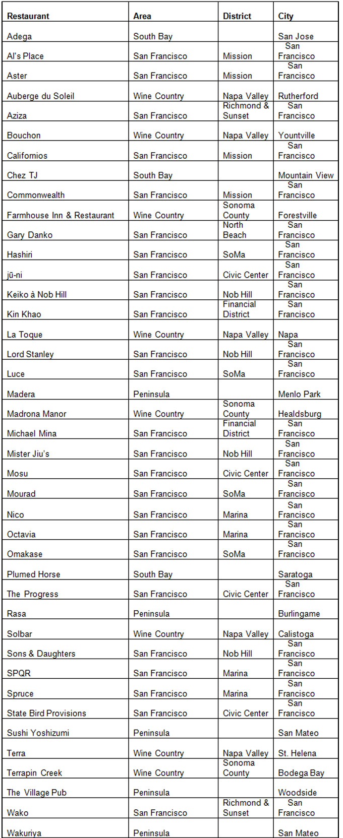 En la categoría de dos estrellas Michelin también hay novedades, se ha incluido un nuevo establecimiento, el Restaurante Lazy Bear del chef David Barzelay, cocinero autodidacta que abrió su restaurante como un proyecto motivado por su pasión por la cocina, ya que anteriormente trabajaba como abogado. Este restaurante se suma al resto de establecimientos en esta categoría, Acquerello, Atelier Crenn, Baumé, Campton Place, Coi y Comi, por lo que el número de restaurantes dos estrellas Michelin asciende a siete. Obviamente desaparece de este listado el Restaurante Quince al haber recibido la tercera estrella.
