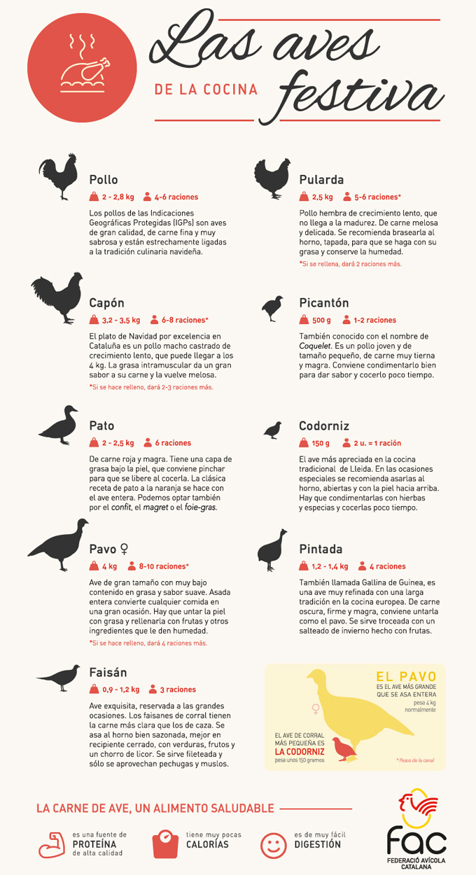 Sobre estas líneas podéis ver la mencionada infografía titulada ’Las aves de la cocina festiva’, y os irá bien consultarla para conocer algunos detalles más de las características de las aves, ampliando la información anterior, especialmente sobre el peso de cada ave y para cuántas personas puede ser cada pieza, cuántas raciones da. Por cierto, os recordamos este post en el que también encontraréis consejos para asar aves, y si tenéis cualquier duda, hacédnosla saber.