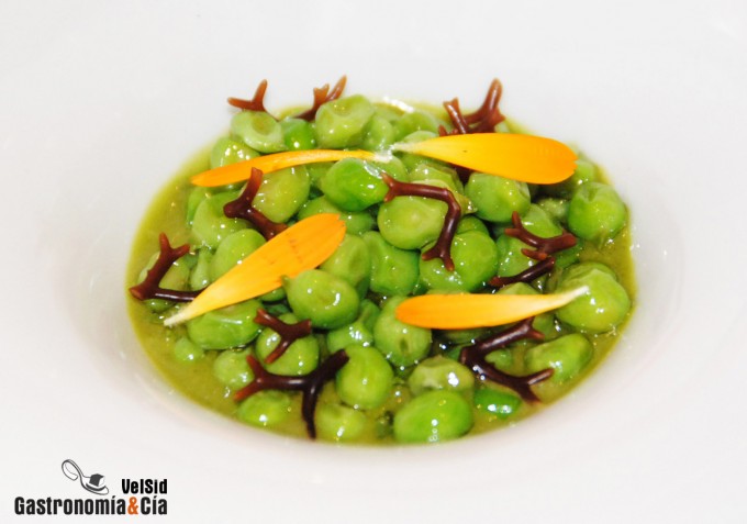 Poner de base en el plato la emulsión de alga codium, encima servir los guisantes salteados ligeramente, los trocitos de alga pistilata y la flor de caléndula.