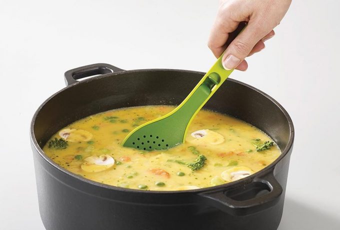 Ya hay bastantes accesorios de cocina que tienen esta función, pero no conocemos ninguno con este diseño que además, cumple más funciones, como veréis a continuación. Nos gusta que sea una cuchara, con un mango largo, porque somos de los que disfrutamos cocinando y estar encima del guiso, meneándolo (si corresponde), viendo y oliendo su evolución…
