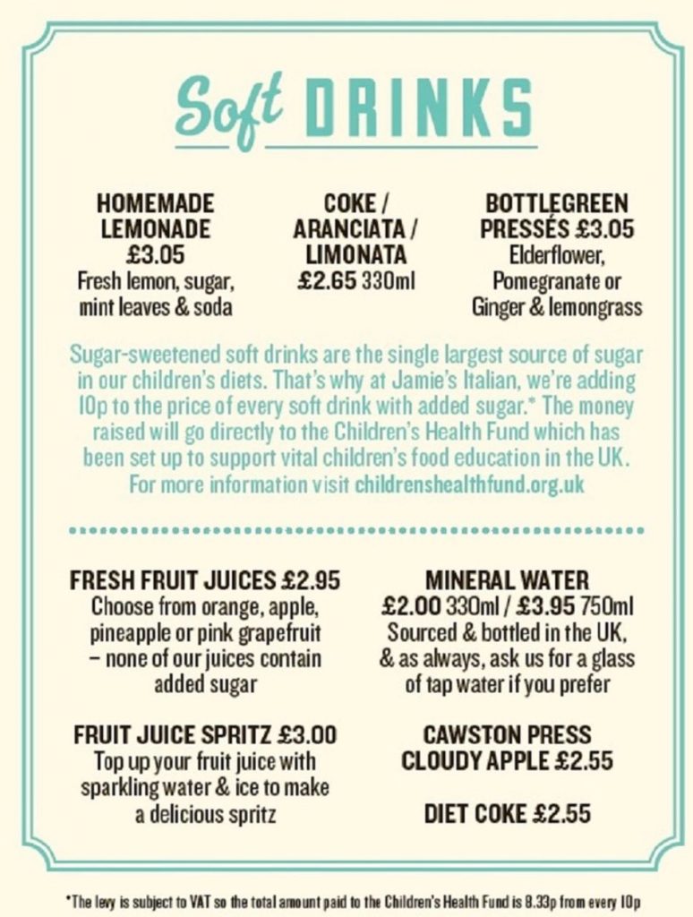 En el año 2015 el cocinero Jamie Oliver decidió introducir un “impuesto de los refrescos” en sus restaurantes del Reino Unido, su propósito era intentar que se redujera el consumo de este tipo de bebidas y lanzar un mensaje al Gobierno del país como respuesta a la negativa de aplicar un impuesto a las bebidas azucaradas, consideradas entonces una de las principales fuentes de azúcar en la alimentación de niños y adolescentes. El cocinero aumentó el precio de los refrescos y bebidas endulzadas 10 peniques (unos 11 céntimos de euro según el cambio actual) en sus restaurantes.