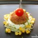 Sirve en la base del plato la lechuga, coloca sobre ella la mozzarella, a continuación la hamburguesa y finalmente, el tomate cherry pinchado con una brocheta. Reparte unos granos de maíz dulce sobre la lechuga, un poco de cebollino picado, sal y finalmente un hilo de aceite de oliva virgen extra. ¡Buen provecho!
