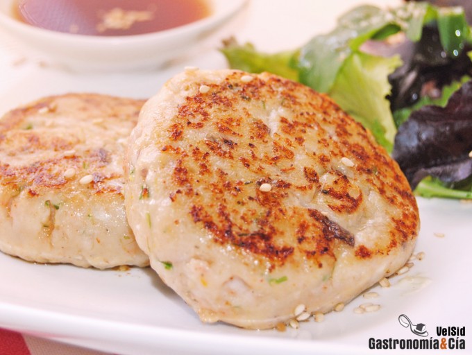 Fáciles de hacer y muy sabrosas, estas hamburguesas de pescado las hemos servido en plato pero también estarían deliciosas con pan de hamburguesas. Como aderezos os recomendamos la salsa ponzu que ya sabéis elaborar y mayonesa de wasabi, tan fácil de hacer como mezclar la mayonesa con la cantidad que os guste de wasabi, pues ya sabéis que es un condimento picante. Tomad nota de la receta de hamburguesas de merluza y gambas, y disfrutad.