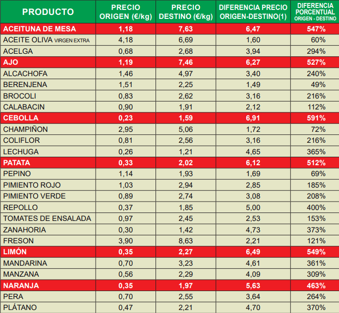 Sin embargo, algunos alimentos básicos destacan por tener una diferencia porcentual origen/destino que puede considerarse especulativa. Si observamos la tabla que proporciona la coordinadora agraria, podemos ver que hemos pagado casi siete veces el valor de las cebollas en el campo. Los intermediarios pagaron a los agricultores una media de 0’23 euros por kilo de cebollas, mientras que en el mercado, el precio medio se estableció en 1’59 euros, lo que indica que en el trayecto del campo a la mesa el precio se multiplicó 6’91 veces.