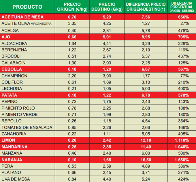 La quinta posición es para la aceituna de mesa, cuya diferencia porcentual origen/destino alcanzó el 656%, y se puede observar que los datos no han variado. En origen el precio medio se estableció en 0’70 euros por kilo, mientras que en el mercado los consumidores pagamos una media de 5’29 euros por kilo. Los datos muestran que en la trayectoria del campo a la mesa este alimento multiplicó 7’56 veces su valor inicial.