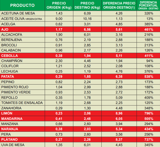 En cuarta posición aparecen las mandarinas con una diferencia porcentual origen/destino del 505%, lo que supone un incremento del 76% sobre los datos de noviembre. En el campo, el kilo de mandarinas se cotizó a una media de 0’41 euros (reducción de un céntimo), mientras que en el mercado los consumidores pagamos una media de 2’48 euros, es decir, 26 céntimos más que en el mes anterior. Los datos reflejan que en la trayectoria del campo a la mesa, las mandarinas multiplicaron su precio 6’05 veces.