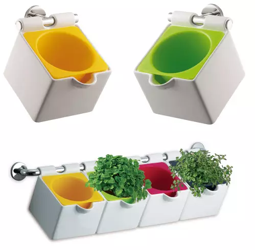 Están disponibles en dos formatos, en macetas individuales en cuatro colores o en grupo de cuatro macetas colgantes con una barra de metal amplia que los sujeta, como el sistema de especieros o cuberteros que tan a menudo encontramos.