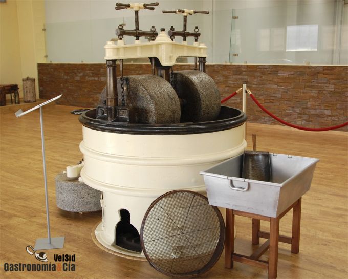 Siguiendo con la historia y maquinaria del turrón, en la foto superior podéis ver un molino de piedra con cuerpo de hierro colado y dos grandes piedras de granito en su interior. Su función era la de moler la primera masa formada por miel y almendras una vez que se había enfriado, la acción de la rotación conseguía moler finamente la masa a través de la molturación y formar lo que sería la base del turrón blando de calidad superior.