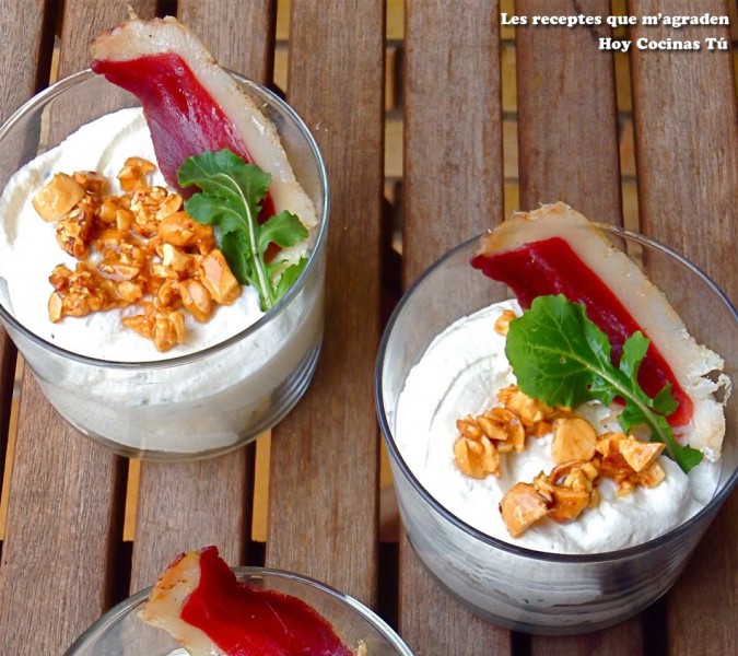 Vasitos de mousse de roquefort con jamón de pato y praliné de avellanas