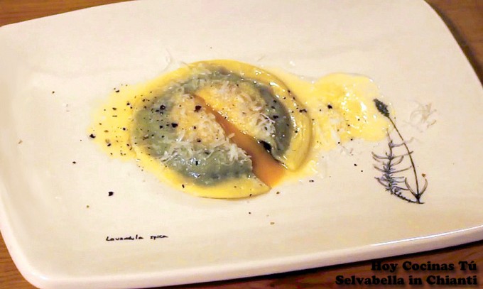 Ravioli con yema líquida y crema de trompeta de los muertos