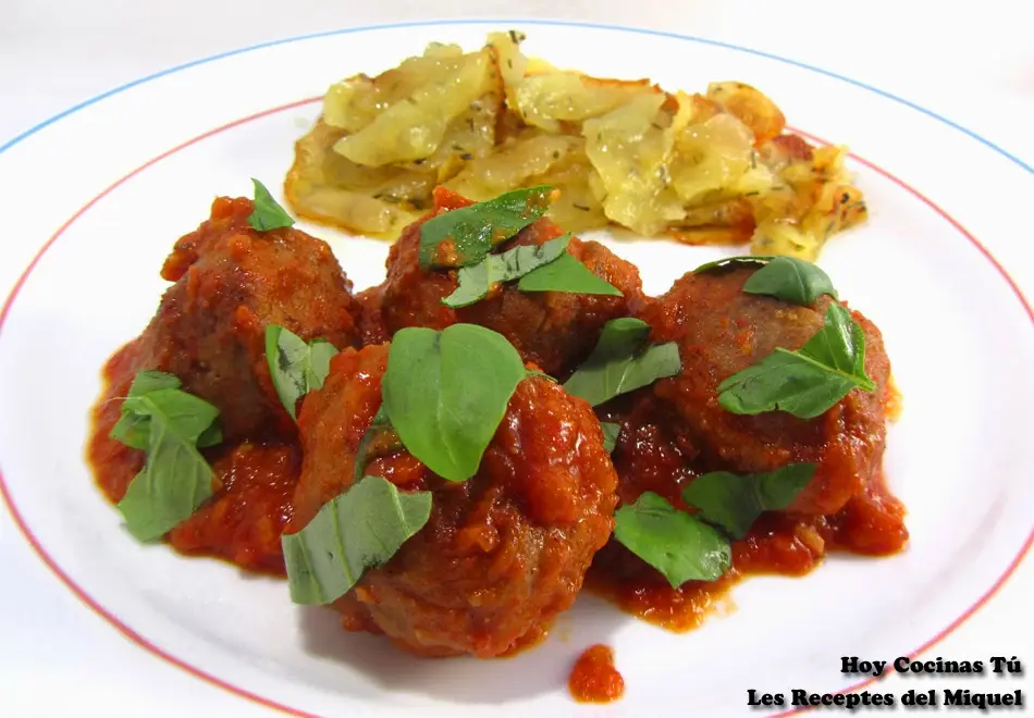 Uno de los placeres de la cocina casera es elaborar albóndigas originales, incorporando sabores que habitualmente no tienen, pues quizá lo más fácil es ir cambiando la salsa en la que se cocinan de vez en cuando. Claro, actualmente también hay muchas personas que compran las albóndigas ya formadas, pero os animamos a que las hagáis vosotros y que probéis nuevas elaboraciones como la que nos propone el autor del blog Les Receptes del Miquel, que comparte en vuestra sección Hoy Cocinas Tú unas Albóndigas de ternera al pesto con patatas.