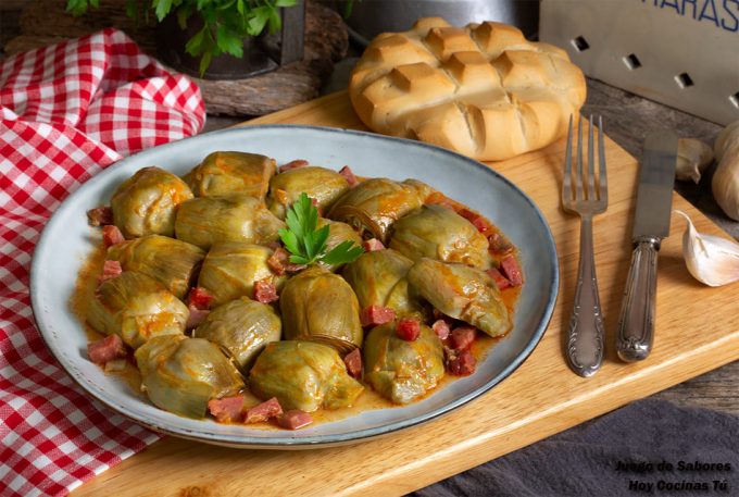 Ese pan de cuadros junto a las alcachofas con jamón que podéis ver ilustrando estas líneas sólo pueden provocar una cosa, ganas de comerlo todo, ¿verdad? Pues el plato de la foto no lo tenemos a nuestra disposición, pero sí tenemos la receta para poner remedio a este pequeño inconveniente, y debemos agradecérselo a Ana y Blanca, autoras del blog Juego de Sabores, que comparten su propuesta culinaria en vuestra sección de recetas ‘Hoy Cocinas Tú’.