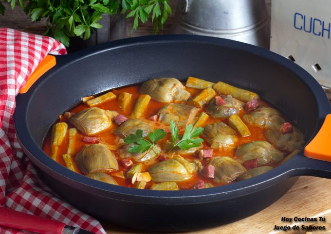 Es muy probable que hayáis disfrutado de las alcachofas con jamón muchas veces, tanto cocinadas por vosotros mismos como por quien cocine en casa, en restaurantes, etc. Y ahora tenéis posibilidad de probarlas con una nueva receta, ya nos contaréis si es parecida a vuestra forma de cocinar las alcachofas con taquitos de jamón. Nosotros sí la probaremos porque solemos hacerlas diferentes, habréis visto varias de nuestras recetas de alcachofas en el blog, en caso contrario, podéis poner el el buscador del lateral ‘Recetas con alcachofas’ y os saldrán para elegir. Recordad comprar las alcachofas frescas bien prietas, si son chatas y con un color limpio y claro, mucho mejor. Y ahora tomad nota de la receta de Juego de Sabores, os encantará.