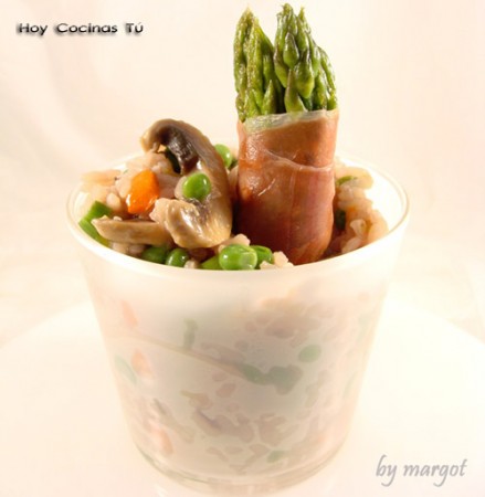 La receta de Hoy Cocinas Tú nos llega de la mano de Margot, es el Arroz con champiñones y espárragos al aroma de jamón que luce en la imagen superior, atractiva presentación como siempre.