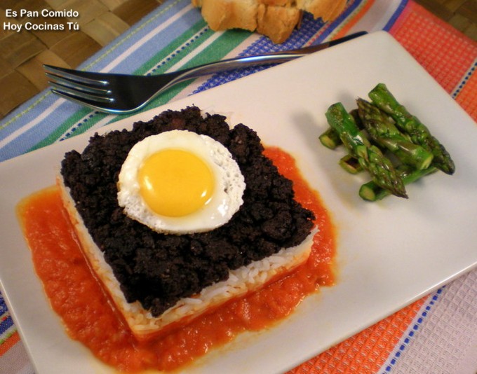 Por la presentación, la autora de este plato lo denomina ‘Arroz blanco y negro con salsa de tomate’, pero hay que decir que el ingrediente negro es morcilla y no contiene arroz, es morcilla de cebolla, una delicia de León. Ana, autora del blog Es Pan Comido, nos cuenta que le gusta aportar color a sus platos, su combinación también provoca la armonía en el palada, imaginad la degustación del Arroz con morcilla y huevo frito.